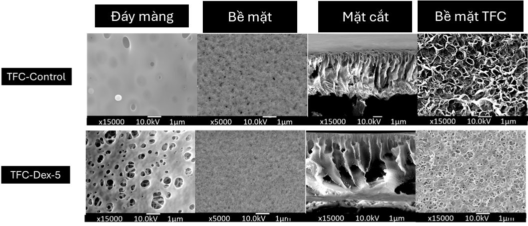 Nhóm nghiên cứu đã chỉ ra rằng, vật liệu dextran – một polysaccharide tự nhiên có tính ưa nước cao khi được thêm vào lớp đế polyethersulfone (PES) đã giúp tăng đáng kể độ xốp và tính thấm ướt của màng, góc tiếp xúc nước giảm, mật độ lỗ rỗng tăng, cấu trúc lớp cắt ngang trở nên xốp hơn. Những thay đổi đã được chứng minh rõ nét qua ảnh hiển vi điện tử quét (SEM).