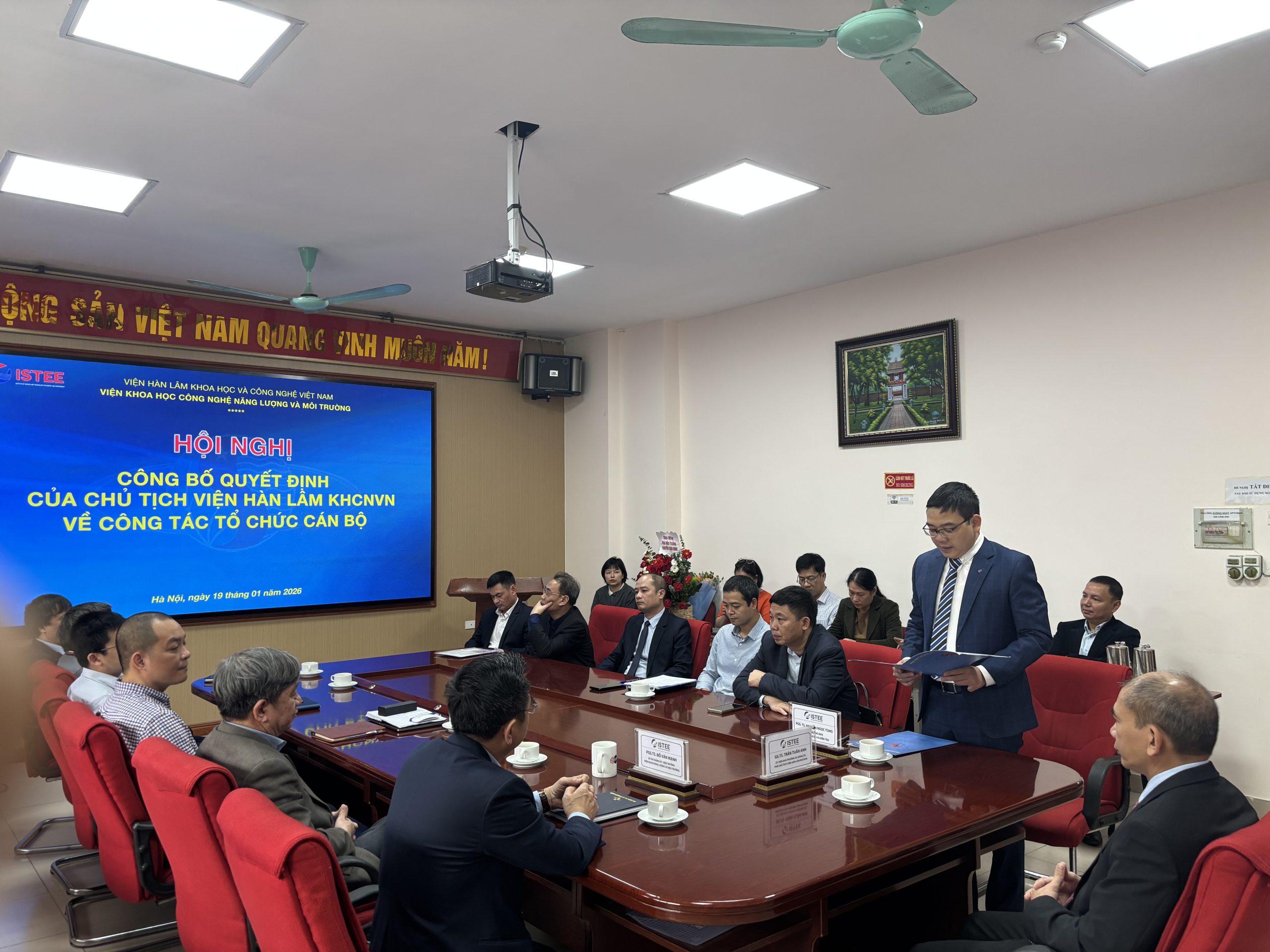 Ngay sau Hội nghị cán bộ chủ chốt, Viện Khoa học công nghệ Năng lượng và Môi trường tổ chức Hội nghị công bố Quyết định của Chủ tịch Viện Hàn lâm KHCNVN về công tác tổ chức cán bộ.Hội nghị có sự tham gia của Phó Chủ tịch Viện Hàn lâm KHCNVN GS.TS Trần Tuấn Anh, Phó Trưởng ban Tổ chức cán bộ và Kiểm tra PGS.TS. Nguyễn Ngọc Tùng cùng toàn thể Lãnh đạo Viện KHCN Năng lượng và Môi trường, lãnh đạo các phòng chuyên môn và Giám đốc các Trung tâm trực thuộc.